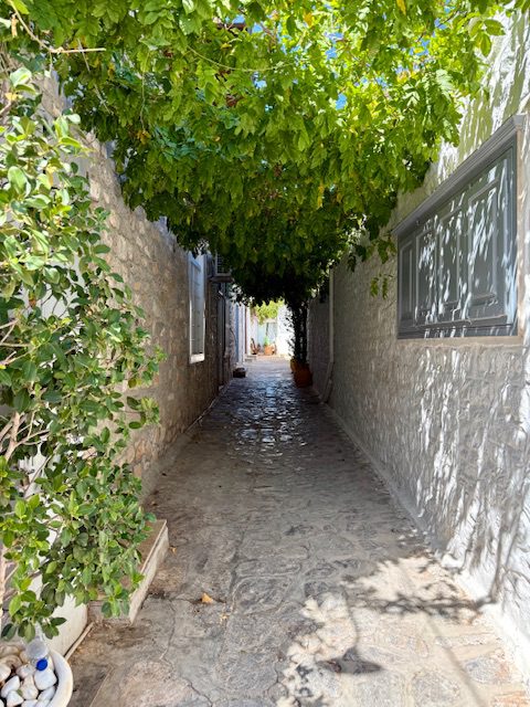 Bygningerne er også alle bygget i Hydra-stil efter fredningens forskrifter, og vejene er belagt med brosten. Meget idylisk! Vi fandt en frokost-restaurant, hvor vi købte en souvlaki med svinekød, som vi delte. Det var meget passende i varmen.